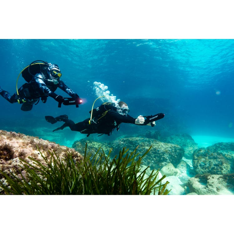 エントリーからプロフェッショナルまで、ダイビングやスイミング、シュノーケルに適したスタンダードモデルの水中スクーター フラッグシップ直径: 80mm / 長さ: 420mm / 重さ: 3.2kg(SMART BATTERY™ 2つを含む) / 水深60m / 駆動時間: 約20分-1.5時間 / 最高速度約7.2km/h