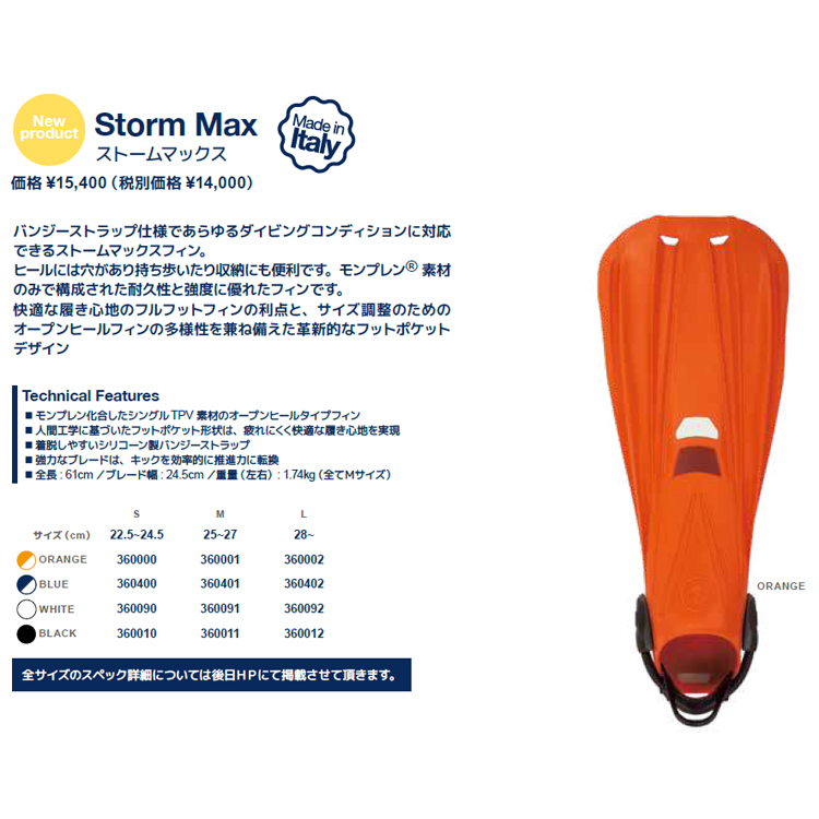 バンジーストラップ仕様であらゆるダイビングコンディションに対応できるストームマックスフィン。ヒールには穴があり持ち歩いたり収納にも便利です。モンプレン®素材のみで構成された耐久性と強度に優れたフィンです。