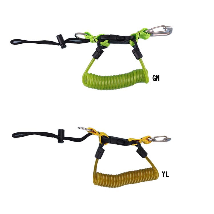 BCジャケットのDリングに引っ掛ける事でカメラや水中ライト、スレートなど様々なアイテムを携帯する事が出来ます。使用する時はカラビナはDリングに掛けたまま、バックルを外せばコイルが伸びて手元で使用でき、使用しない時は バックルをはめれば不要にブラブラせずコンパクトに携帯させる事が出来便利です!