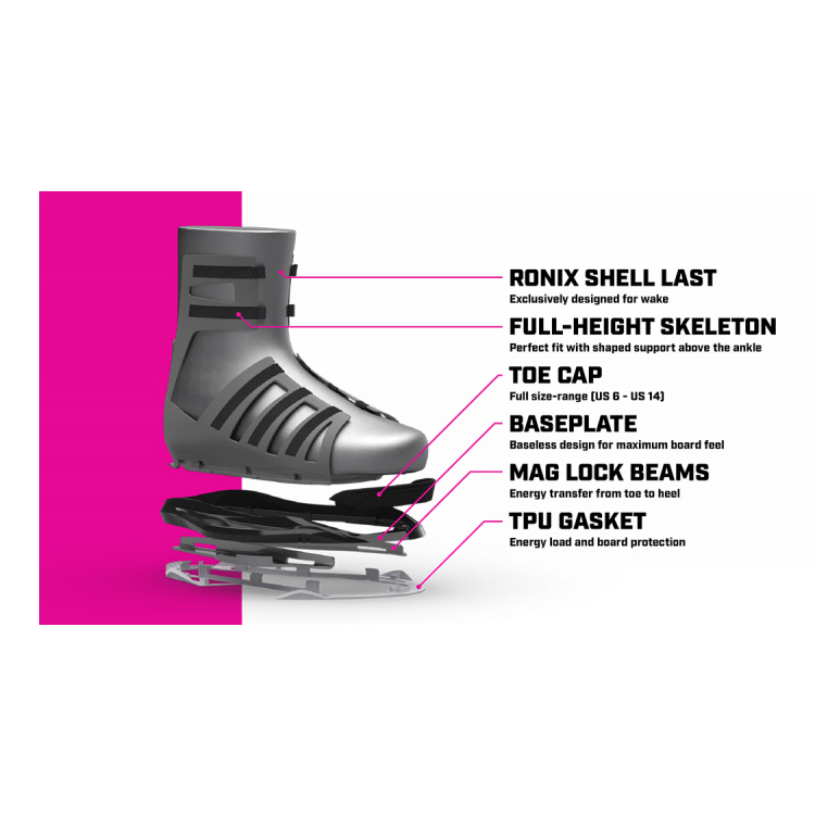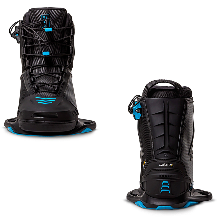 RONIX(ロニックス)2023年モデルウェイクボード用ブーツ(ビンディング)。アメリカ製のカーボンファイバーであるCarbitex CX6を採用し、高い精度に併せて柔軟でありながら 内側と外側で異なったフレックスパターンを持たせる事で高いパフォーマンスを可能にしています。