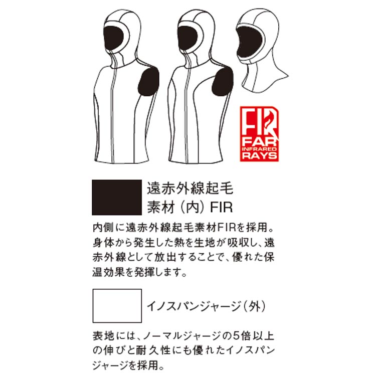 保温性や運動性を考慮し、FIR(遠赤外線起毛素材)を採用して保温性も抜群のフードベスト