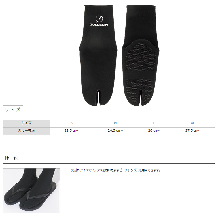 スキンダイビング、フリーダイビング用品GULLSKINのカーボンフィン着用時のフィンずれを防止する3mm足袋型ソックスフィンずれや、サイズの調整だけの利用ではなく、ビーチサンダルを履いたまま使用できるよう先割れ形にし、足首まで保温できる機能的なアイテム。