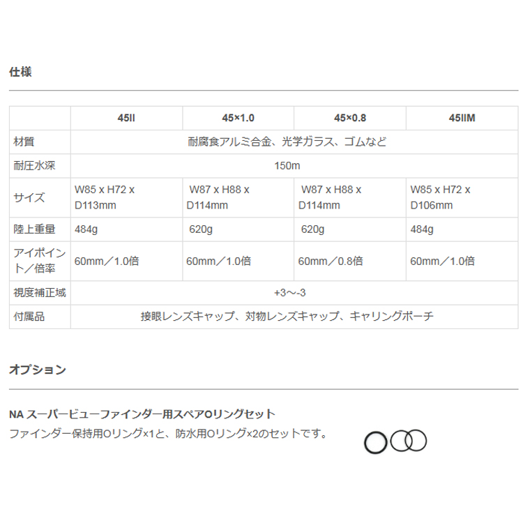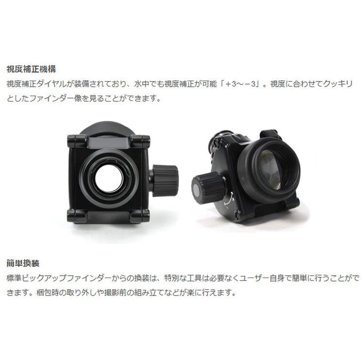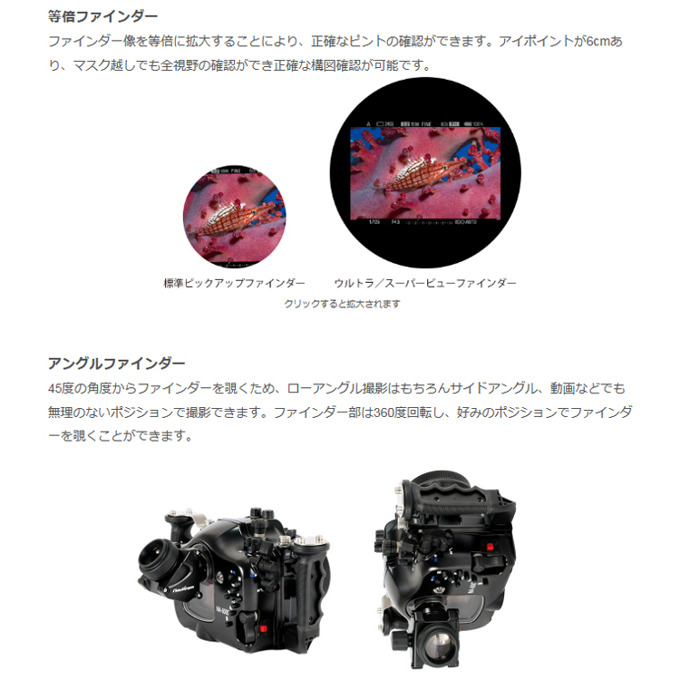 水中で+3〜-2の視度補正操作が可能な45アングルビューファインダーです。等倍で全視野を確認でき、本体は360度回転対応。