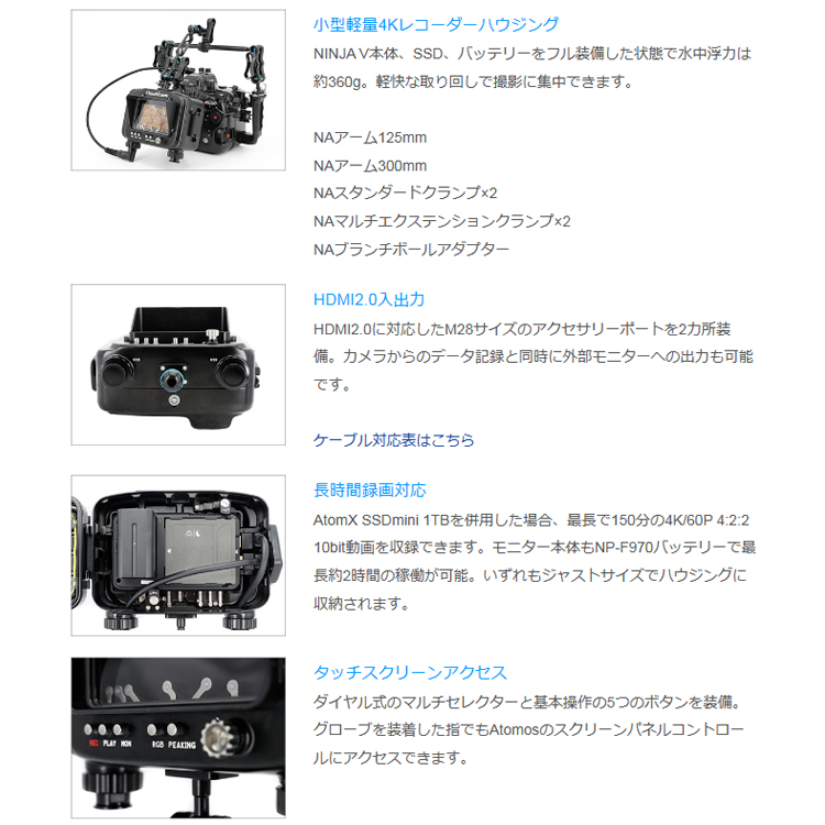 NauticamがこれまでAtomosモニター/レコーダーハウジングで築いてきた実績をもとに、HDMI 2.0をサポートする新しいM28大口径バルクヘッドを中心に構築されたハウジングです。