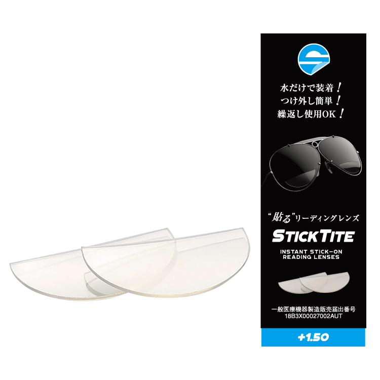 アイウェア(サングラス、水中マスク、セーフティーグラス、溶接マスク)などに水を付けて貼るだけで バイフォーカル(二重焦点)リーディングレンズに早変わり!何度でも繰り返し利用可能。