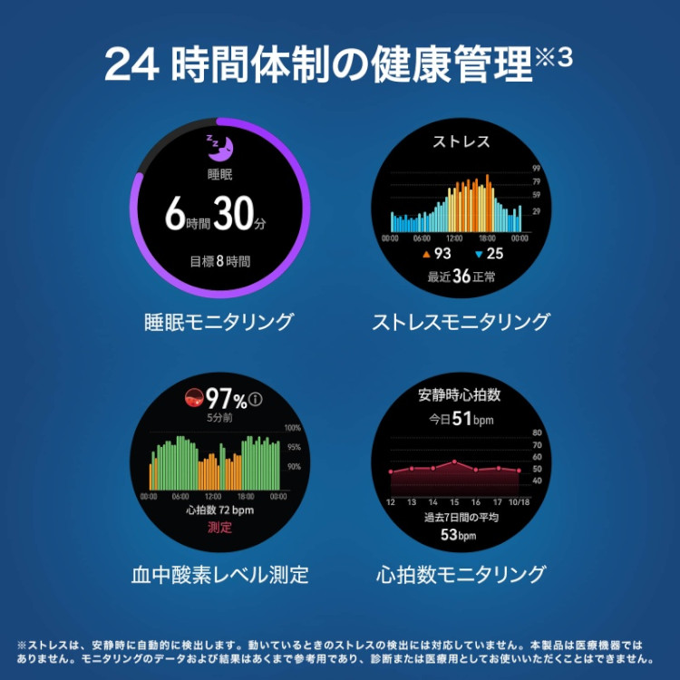 ストレスモニタリング、睡眠モニタリングおよび生理周期予測を含めた様々な健康モニタリング機能により、