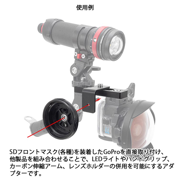 SDフロントマスク(各種)を装着したGoProを直接取り付け、他製品を組み合わせることで、LEDライトやハンドグリップ、カーボン伸縮アーム、レンズホルダーの併用を可能にするアダプターです。