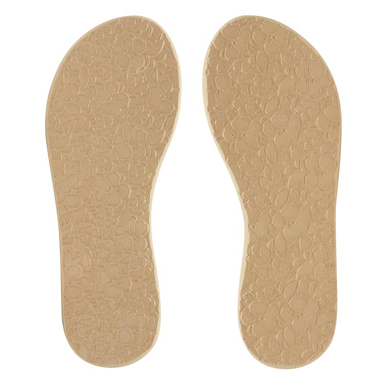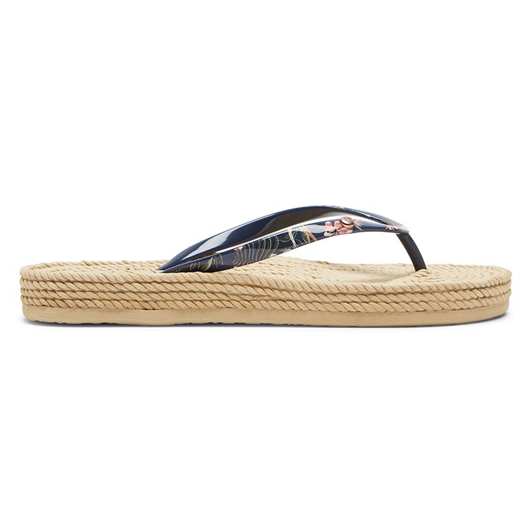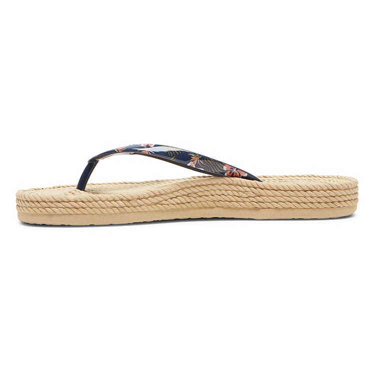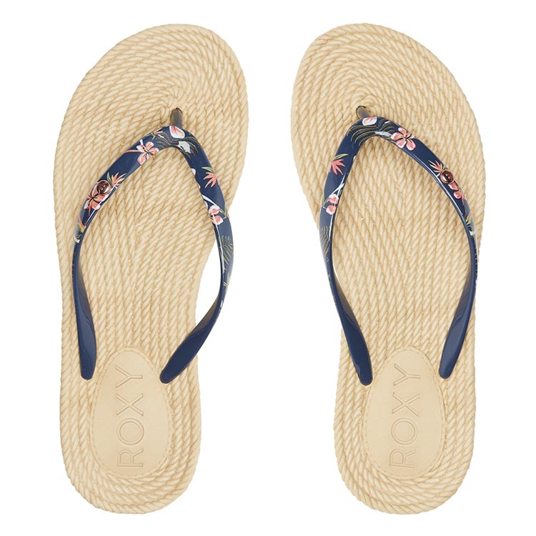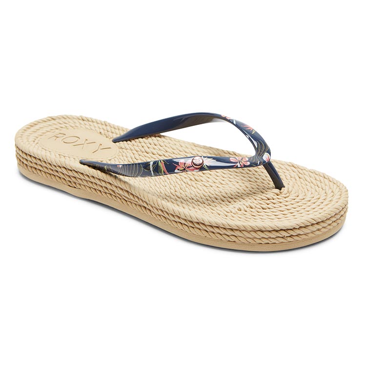 ジュート素材風のフットベッドの雰囲気がエスパドリューを思わせるデザインのビーチサンダル。ナチュラルなデザインと、細め幅のシルエットがさりげなく女性らしさをアシストしてくれます。ストラップにはトロピカルムード漂う柄模様でメリハリをプラス。フットベッドの指先に引っかかりがあるので、脱げづらく歩きやすさをサポートします。