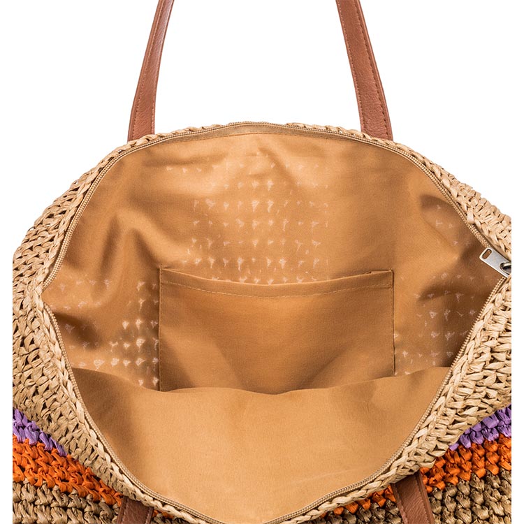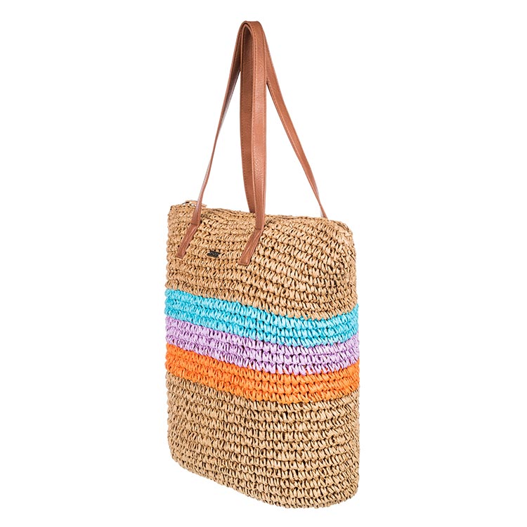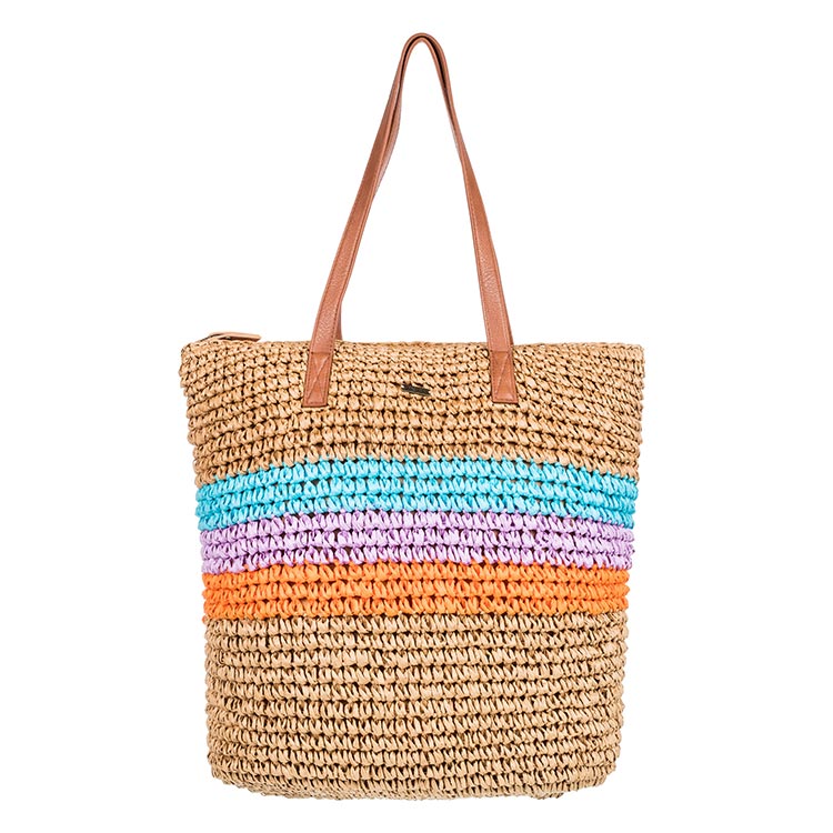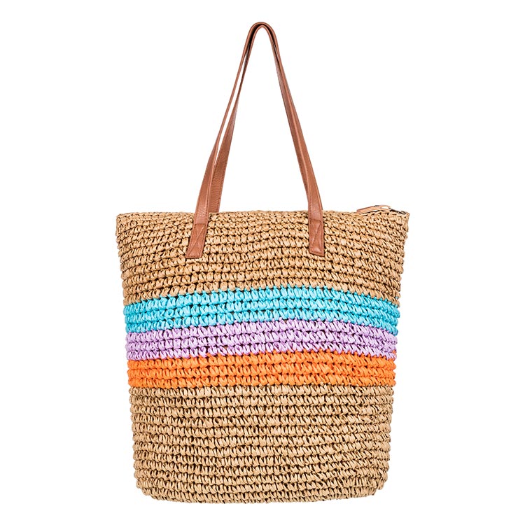 ペーパー素材を使った春夏シーズンにぴったりのリゾート調バッグ。キュートなカラーリングのデザインが魅力です。レザー調の持ち手と、バッグ本体には裏地が付いているので、伸びることなく安心して荷物を入れられます。取り出し口にはファスナーを採用。マチ部分の底板を倒したりすることで、荷物の量に合わせて幅を調整できます。◆サイズ:H40cm x W39cm x D16cm