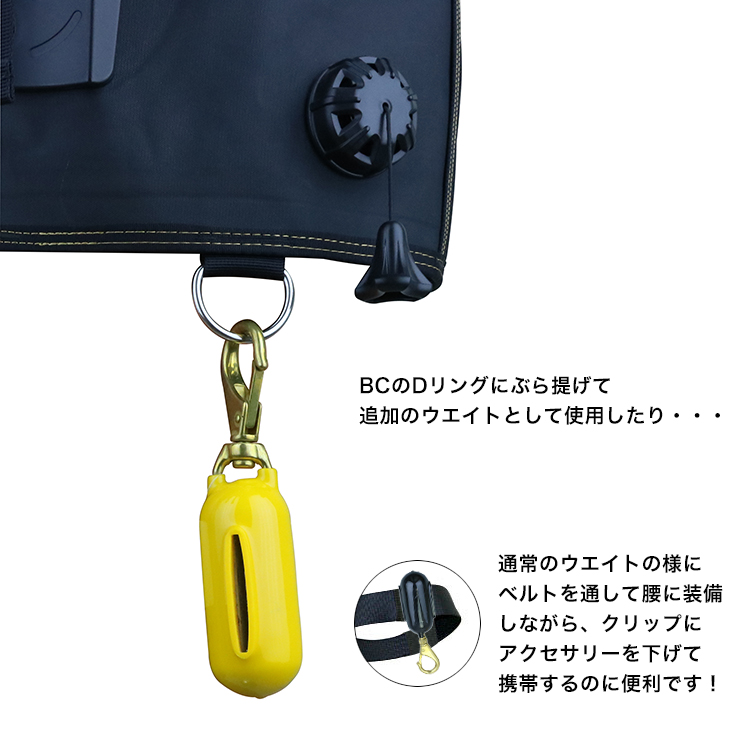 またガイドやインストラクターが引率のダイバーに追加ウエイトとして持たせる際には、 カラビナクリップをBCのDリングに引っ掛けるだけで手軽に持たせる事も出来ます!