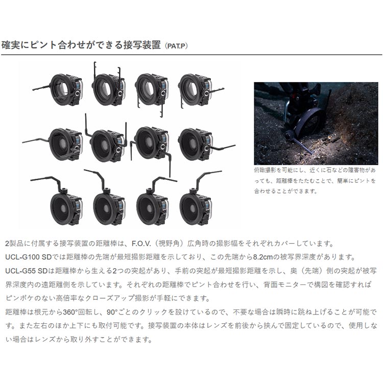GoPro® HEROシリーズに対応する水中クローズアップレンズについて、さらにラインナップを拡充します。 新しいクローズアップレンズは、発売中の「 UCL-G165II SD 」に比べて2倍の高倍率を実現した「UCL-G100 SD」、今までにない4倍の超高倍率な撮影が可能な「UCL-G55 SD」の2製品です。(倍率は何れもスケール比。面積比の倍率はスケール比の2乗となります。) 2製品にはそれぞれ、UCL-G100 SDでは最短撮影距離、UCL-G55 SDでは最短撮影距離とフォーカス範囲が直感的に分かる接写装置が付属しており、ピント合わせを強力にサポートします。 接写装置から伸びる距離棒の幅は、左右の撮影範囲(F.O.V.広角時)を示しており、不要な場合は瞬時に距離棒を跳ね上げできる機構になっています。またこの距離棒は、左右のほか上下にもセット可能です。 接写装置はレンズ本体を前後から挟み込んで固定する方式なので、運搬時はレンズから取り外すことが可能です。【仕様】