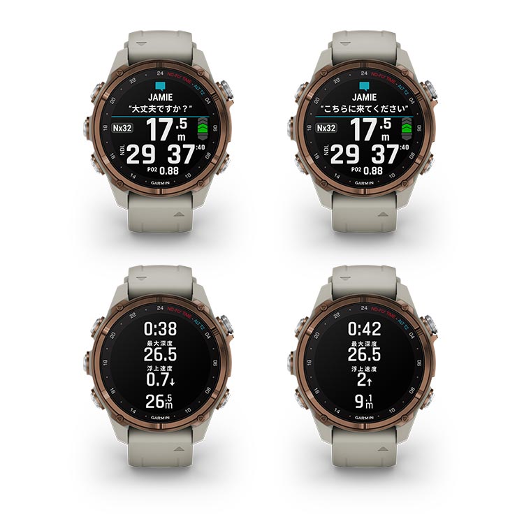 ◆ダイブ中の警告アラート:浮上速度、PO2、CNS/OTU、NDL、ガス切り替えを警告するサウンドとバイブレーションのアラート。ダイビングモードごとにオン/オフ設定可能な深度またはタイムに基づくサウンドとバイブレーションのアラート。(最大40件)