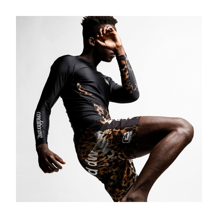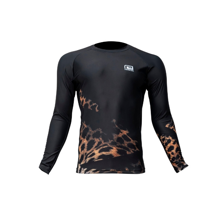 ビースティかつ深みのあるシーズングラフィック「Leopard」がアシンメトリーに配されたロングラッシュガード。