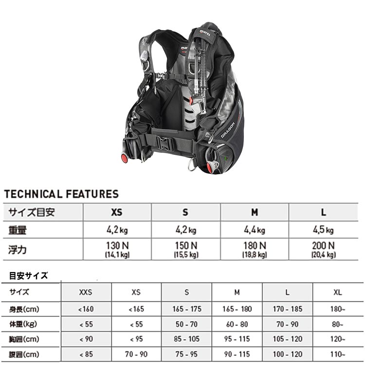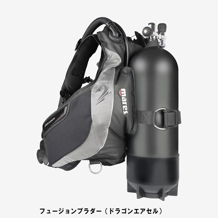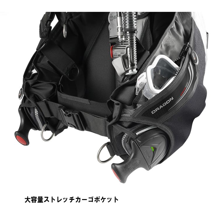 ドラゴン SLS BCDは並外れた安定性、快適性があり、頑丈で耐久性があります。ジャケットには新しいSLSバラストシステムが装備されています。シングルプレートのバックレストが装備されておりシングル及びダブルタンクに適しています。大きな浮力の「ドラゴン」ウイングが付属します。