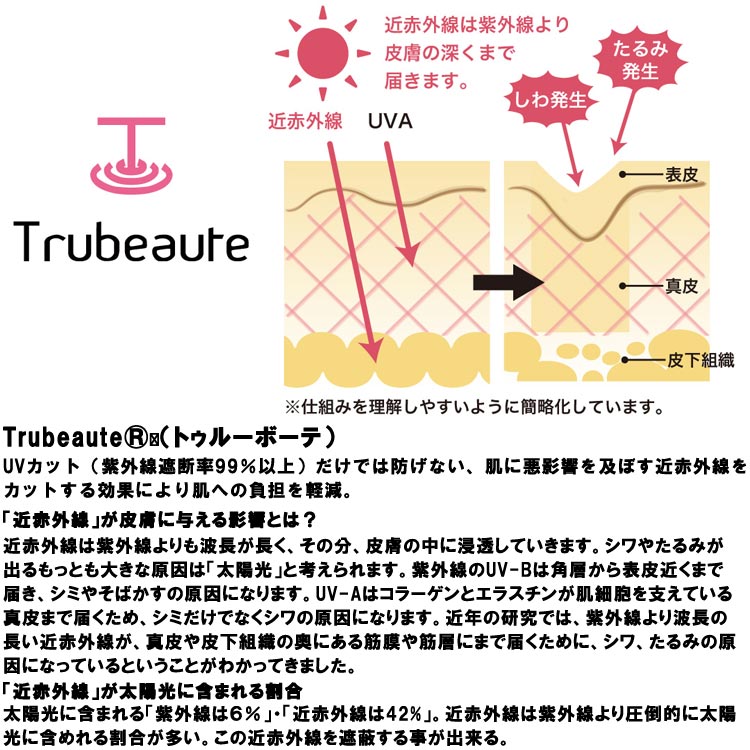 太陽光に含まれる近赤外線を吸収カット、UVカット(紫外線遮断率99%以上)も同時にカットし、肌への負担を軽減。温度上昇も抑えられ涼しく着心地も快適です。