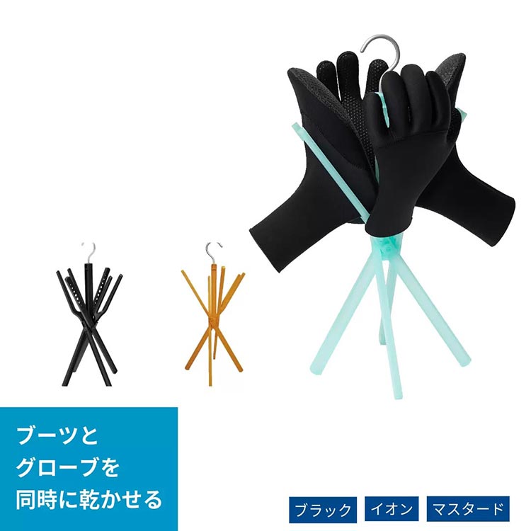 ブーツとグローブを同時に乾かすことができ、持ち運びや収納時にはコンパクト&スリムに折りたためる、ハンガーです。使い勝手はそのままに、耐久性と強度がアップしました。