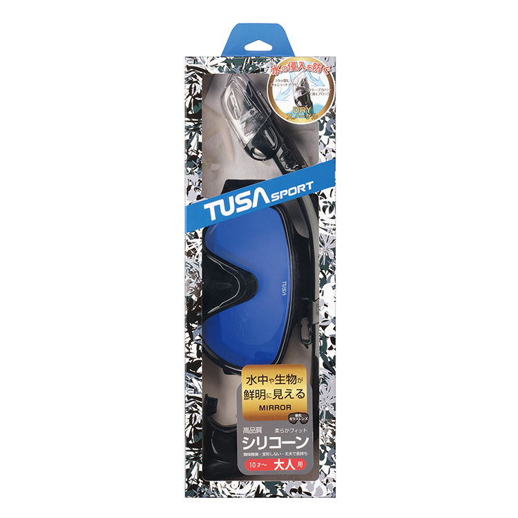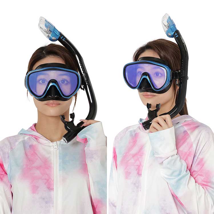上方向・下方向ともに広視界で、水中や生物が鮮明に見えるミラーレンズマスクと豊富な機能を搭載したスノーケルの2 点セット