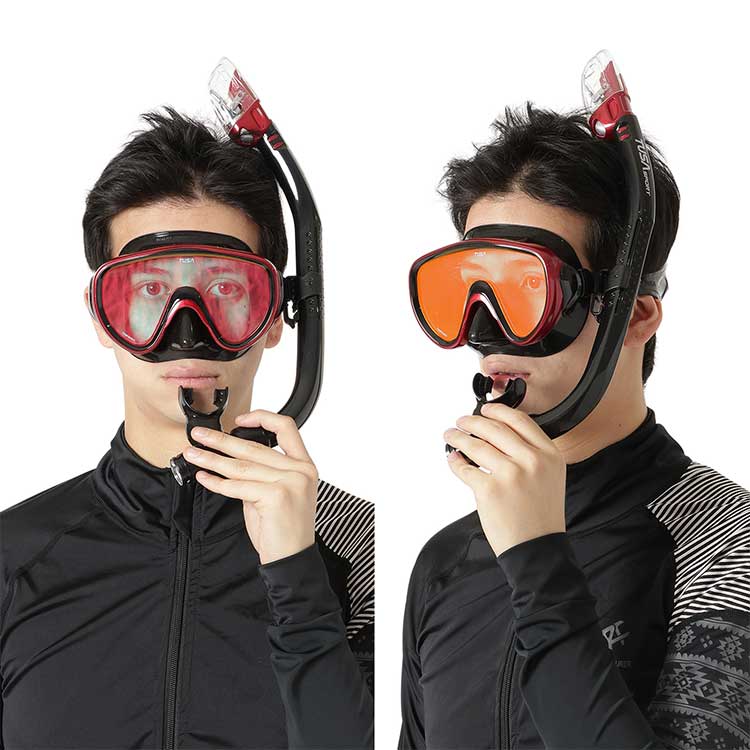 また視界が明瞭に見えるアンバーレンズは、見える景色に少し黄みがかることで、水中で失われがちな色を補正する効果があります。