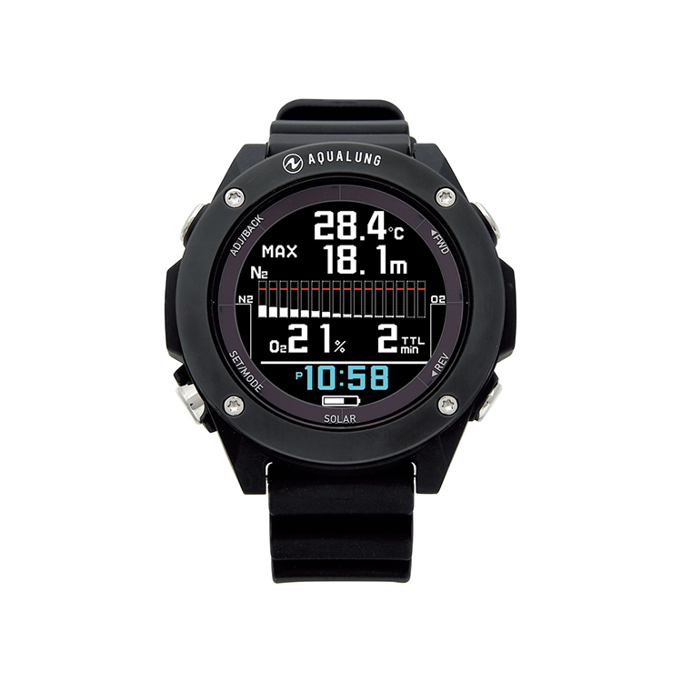ソーラー充電/USB充電の2タイプの充電方式に対応したカラー液晶ダイブコンピューター。タンク残圧をモニタリングできるトランスミッター2にも対応。