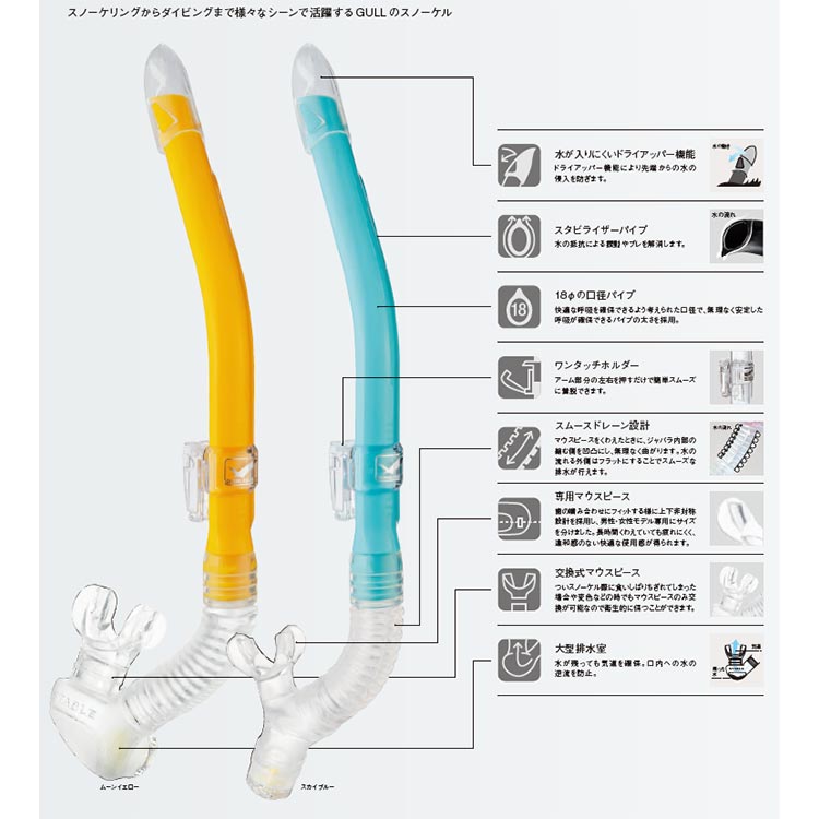 スノーケル内に入った水を簡単に排水出来る排水弁を装備したシンプルなスタンダードタイプのスノーケル。