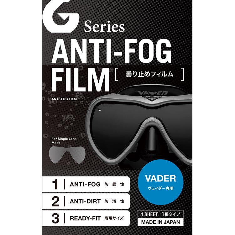 ダイビング器材の国内人気メーカー「GULL(ガル)」のマスク用曇り止めフィルム。GULLのフラッグシップモデルがラインナップされている「Gシリーズ」の「VADER(ヴェイダー)」専用曇り止めフィルム。