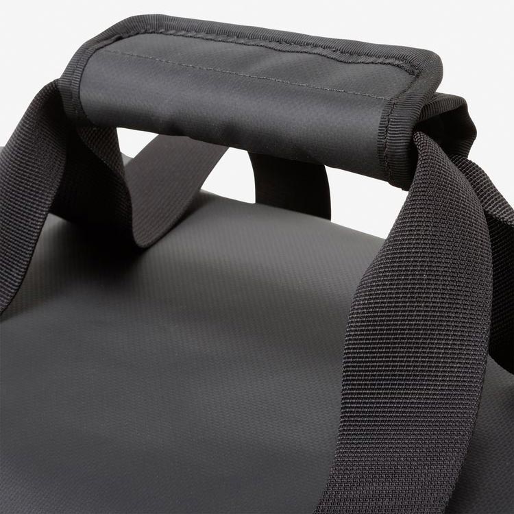 上部のキャリーハンドルの他に、本体の側面に2ヵ所のグラブハンドル付き。メイン素材は、環境に配慮した1000デニールのリサイクルポリエステルに、TPEファブリックラミネートを施した高強度の生地を採用。濡れや汚れに強いTPEファブリックラミネート素材は、重い荷物でも気兼ねなく収納できる高い耐摩耗性が特長です。