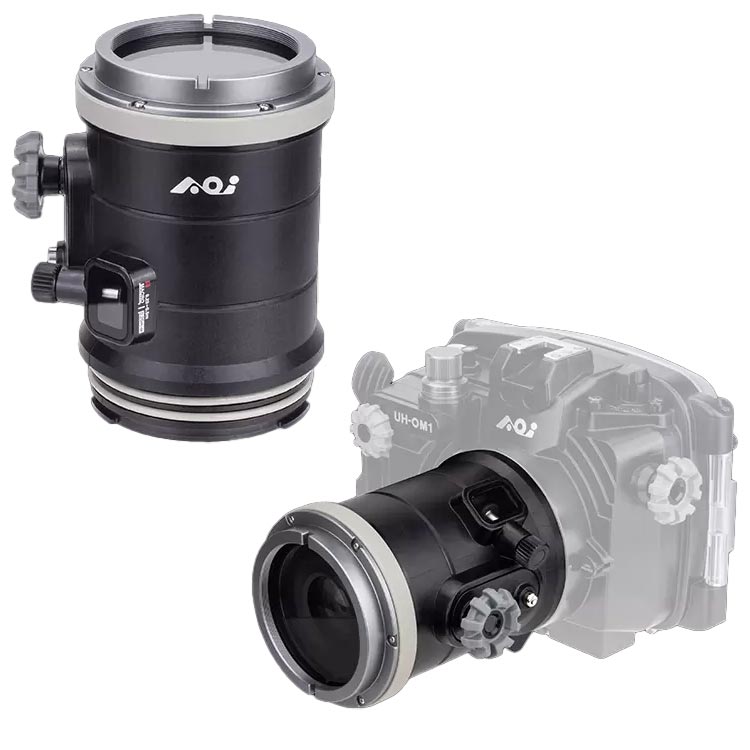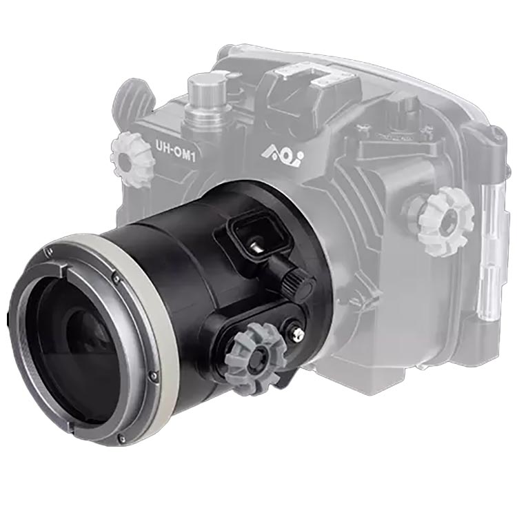 コンパクト設計のED 90mm Macro PRO Lens用ポート。超高倍率撮影を可能とした高性能望遠マクロレンズの性能を水中でフルスペック発揮することができます。従来の90mmマクロレンズポート(FLP-08)は中間ポートを利用するタイプでしたが、FLP-09はまったく新しい専用設計で、UH-OM1やUH-EM10IVにダイレクトに取り付けることができます。