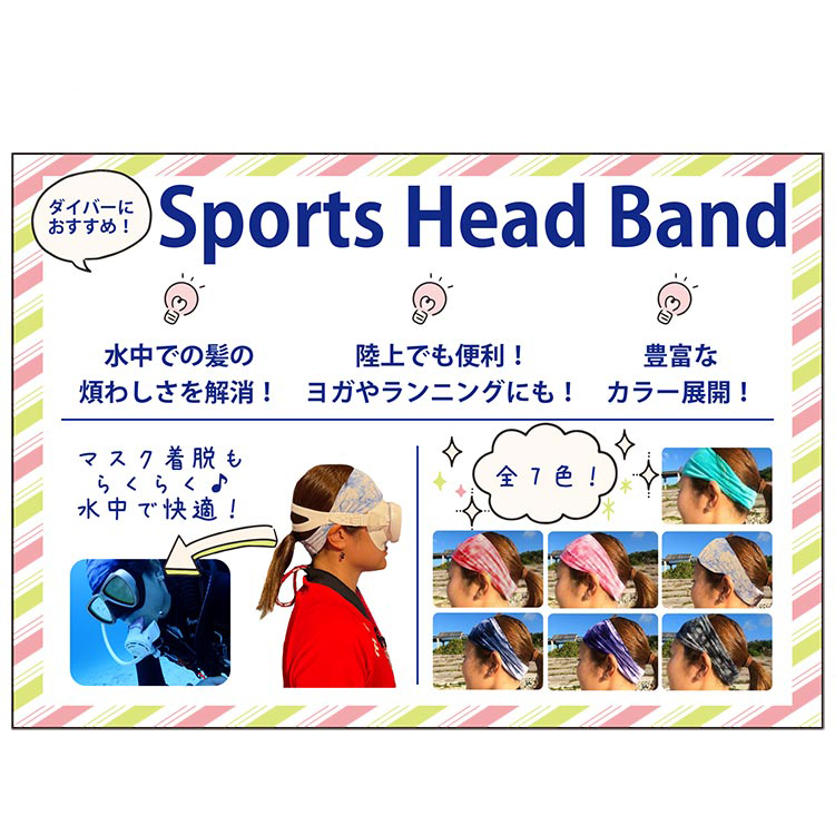 スポーツヘアバンド。ダイビング、サーフィン、ウェイクボード等、マリンスポーツにオススメです。◆サイズ:フリーサイズ
