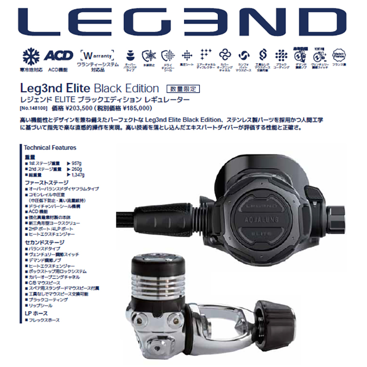 高い機能性とデザインを兼ね備えたパーフェクトなLeg3nd Elite Black Edition、ステンレス製パーツを採用かつ人間工学に基づいて指先で楽な直感的操作を実現。高い技術を落とし込んだエキスパートダイバーが評価する性能と正確さ。状況に合わせて流量調整ができこれまでにない最適な呼吸感をご提供できるハイエンド仕様で上級ダイバーにもおすすめです。