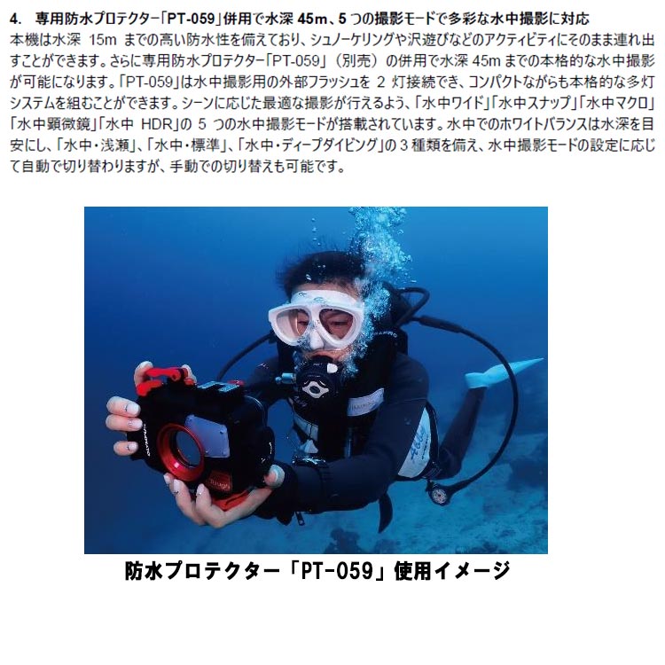 ◆専用防水プロテクター「PT-059」併用で水深45m、5つの撮影モードで多彩な水中撮影に対応