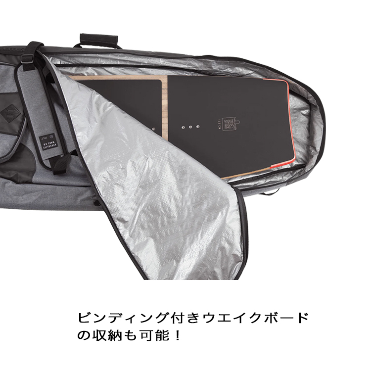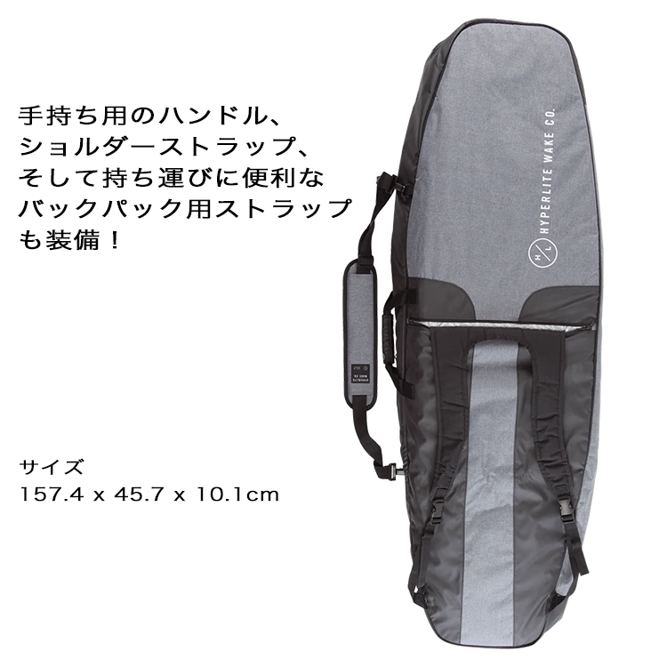 ウエイクボードの人気メーカー[ HYPERLITE (ハイパーライト) ]のボードケース。ハイパーライトの代表ともいえるシステムビンディングを付けたボードの収納も可能となっています。