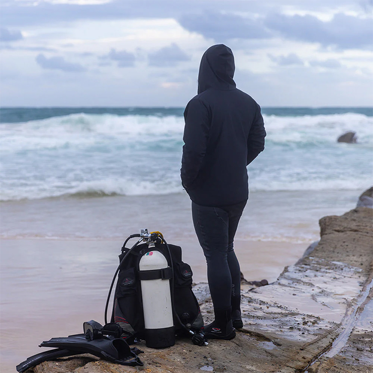 マリンスポーツの選手の為に開発された防寒用マテリアルで、2.5mm〜3mm厚のウェットスーツにも 使われるネオプレン生地を採用した3層からなる生地は防水、風冷から身体を守り高い保温効果を持っています。