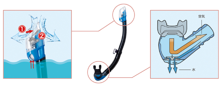 それにより、非常に楽なスノーケルクリアが可能。スノーケルクリア時に水が残っても、