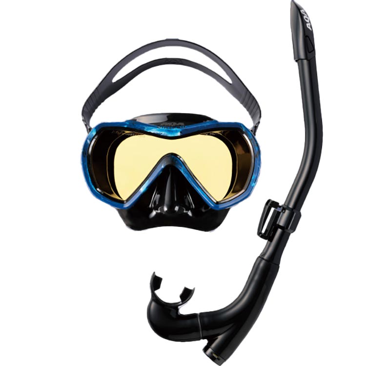 AQAで一番視界が広くUVカットのプラスチックレンズを搭載した軽量新型マスクとJ型スノーケルの2点セット視界が広くなることで水中での圧迫感も軽減し、水流でスノーケルがブレにくくスノーケリングをさらに楽しめるセットです。