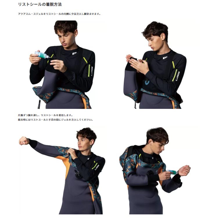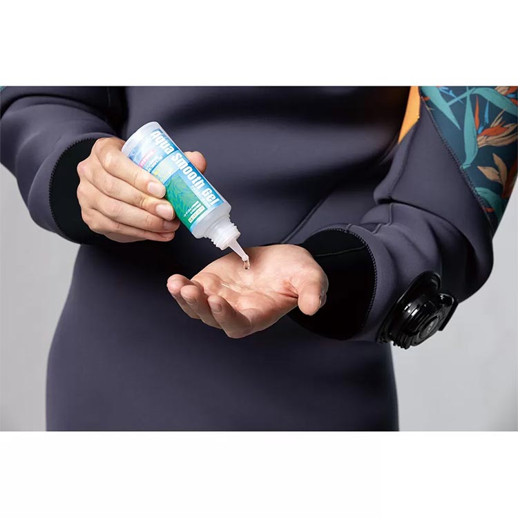 ドライスーツとウェットスーツの両方で使用可能な着脱補助ジェルです。スキン面に適量を塗ることで、着脱の困難なラバー部分がスルリと着脱できます。容器の先端ノズルをスーツと肌の間に差し込むことができるので、着衣状態でもジェルの注入は容易。無香料、無着色、ノンシリコン、鉱物油、紫外線吸収剤などを使用しない、肌にも環境にも配慮したユーカリエキス配合のジェルです。多くの方に使っていただきたくお求めやすい価格でご用意しました。