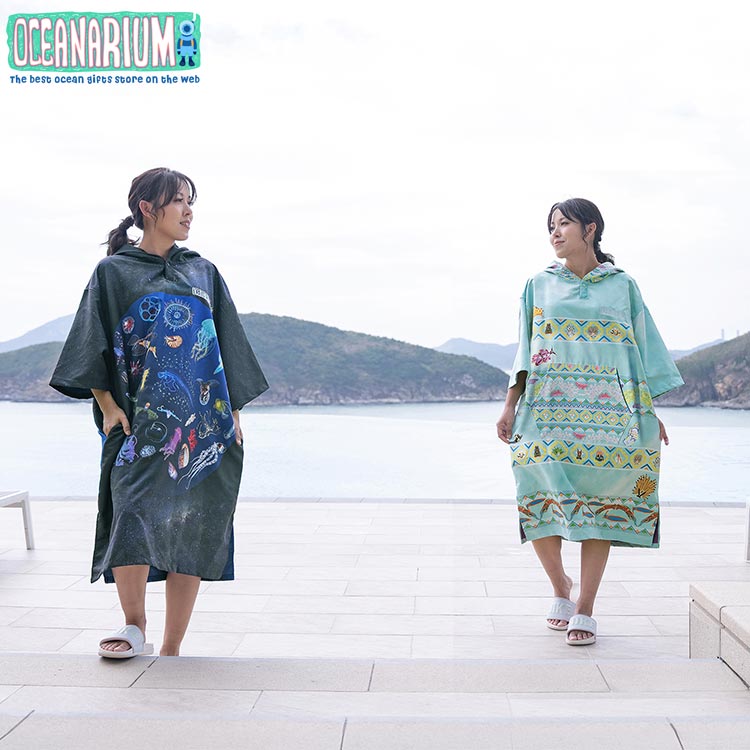 海の生物をプリントした肌触りの良い速乾性のドライタオルでできたお着替えポンチョです。