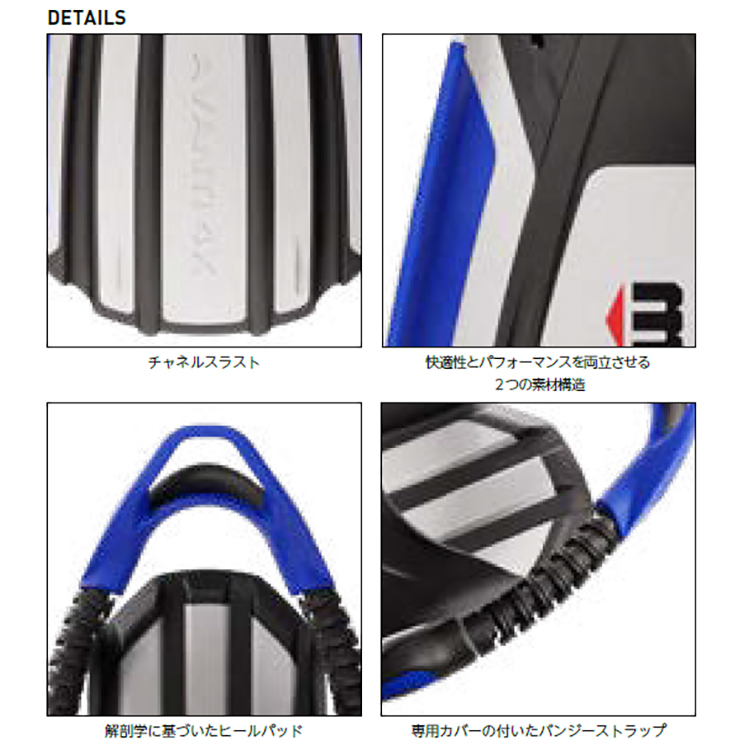 ■ バンジーフィンストラップと解剖学に基づいたヒールパッド形状