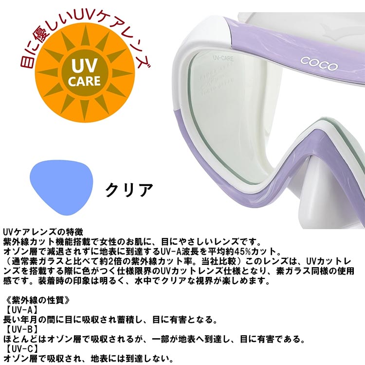 紫外線カット機能搭載で女性のお肌に、目にやさしいレンズです。オゾン層で減退されずに地表に到達するUV-A波長を平均約45%カット。(通常素ガラスと比べて約2倍の紫外線カット率。当社比較)このレンズは、UVカットレンズを搭載する際に色がつく仕様限界のUVカットレンズ仕様となり、素ガラス同様の使用感です。装着時の印象は明るく、水中でクリアな視界が楽しめます。