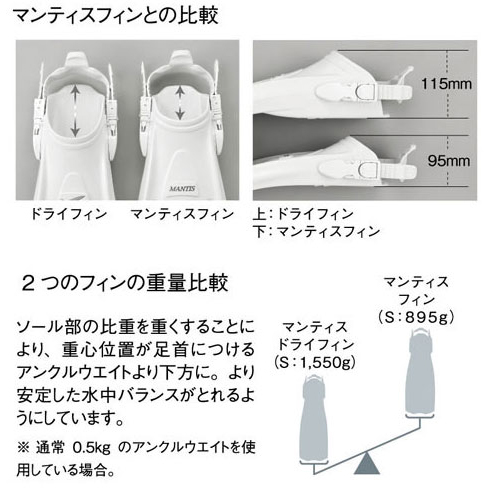 ブーツポケットのソール部の比重を重く設定することで、アンクルウエイトを不要にした、ドライスーツ専用のフィンです。◆素材:ラバー、重量:アンクルウエイトを使用しなくてもよい重量設定になっています。