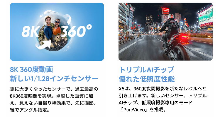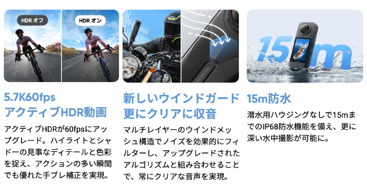 | 動画解像度 | 360度動画モード: 8K: 7680x3840@30/25/24fps 5.7K+: 5760x2880@30/25/24fps 5.7K: 5760x2880@60/50/48/30/25/24fps 4K: 3840x1920@120/100/60/50/48/30/25/24fps シングルレンズ動画モード: 4K:3840x2160@60/50/30/25/24fps 2.7K:2720x1536@60/50/30/25/24fps 1080p:1920x1080@120/100/60/50/30/25/24fps |