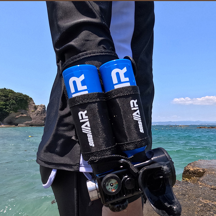 → small AIRは腕につける超小型ボンベです。600g、17cmと小型で超軽量。水着やラッシュガードのまま使うことができ、しかも両手が空きます。