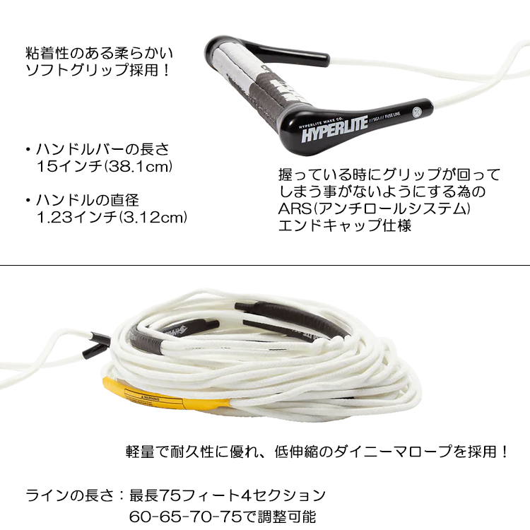 ウエイクボードの人気メーカーHYPERLITE(ハイパーライト)のハンドルとラインがセットになった商品。このSGパッケージは「ステッチ(縫目)」「スティッキー(粘着性)」「ソフト(柔らかい)」のSの頭文字を取った高品質グリップハンドルです。