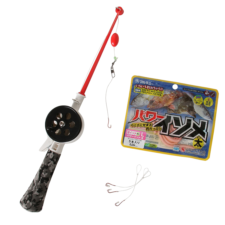 ◆釣り竿・疑似餌(パワーイソメ)、予備ハリス、予備ハリがついていて、すぐに始められるシュノーケリングフィッシングセット
