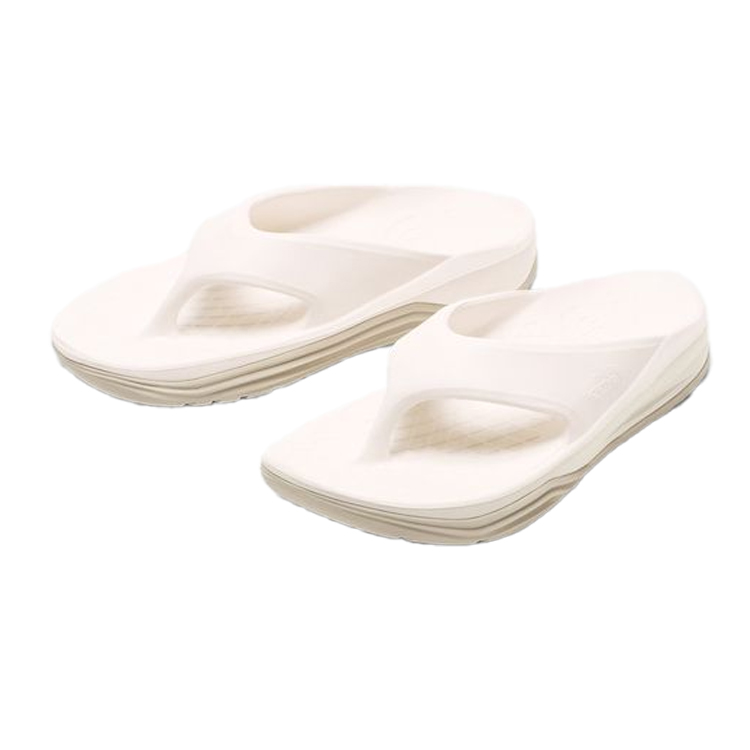 つま先が上がったセミロッカー構造は、歩行時の蹴りだしをサポート。足の甲を面で支える太めのトングと足のアーチを支える構造で、足を包み込むようにフィットします。