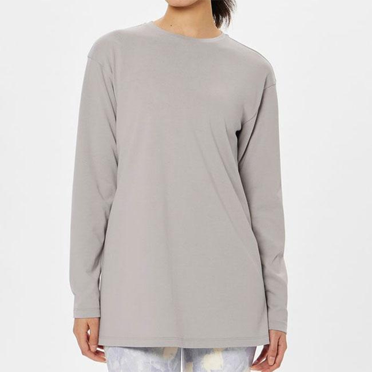 バックギャザーが特徴的な長袖トップスです。汗を素早く吸収して乾かす吸汗速乾機能、UVケア(UPF15-30、紫外線カット率85%以上)機能、ストレッチ性を兼ね備えたコットン混素材を使用しています。