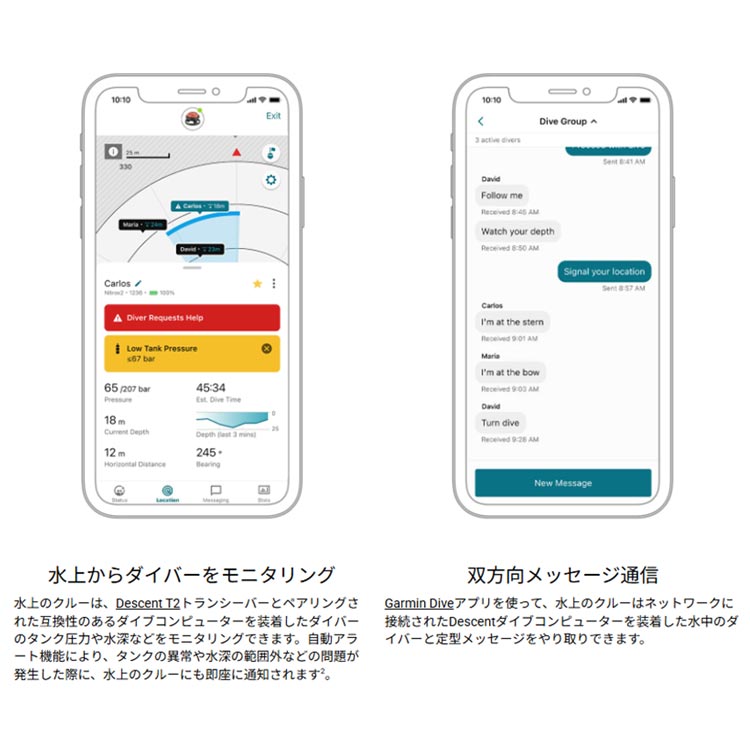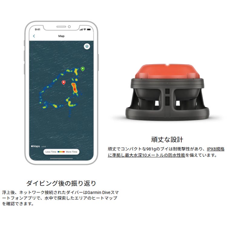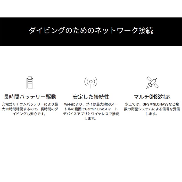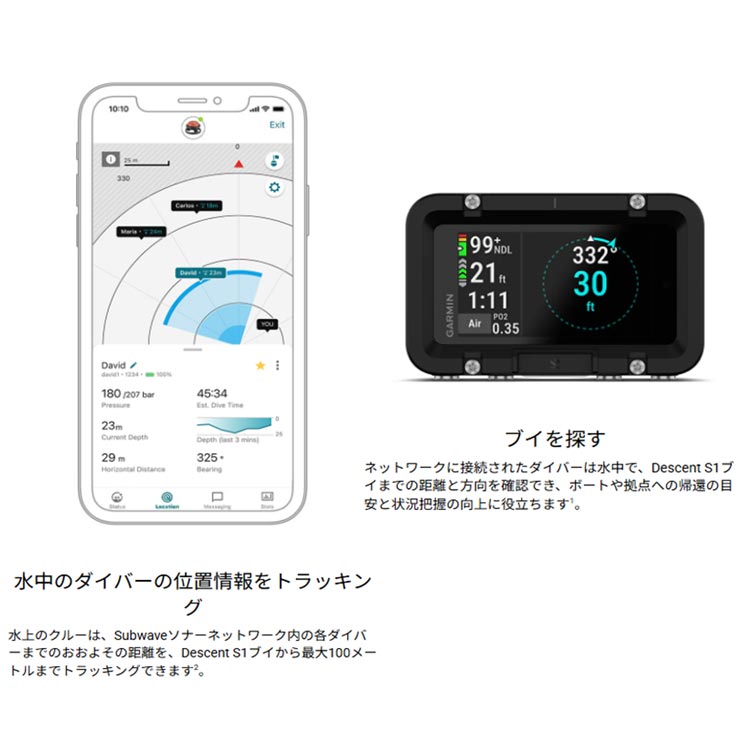 Descent S1 Buoyは、Garminのダイビングエコシステムと連携し、水上のクルーが水中にいるダイバーの位置や状況をリアルタイムに確認できるダイビング用通信ブイです。Descent T2トランシーバーとペアリングした互換性のあるダイブコンピューターを装着したダイバーと、定型メッセージをやり取りすることも可能です1。 さらに、ネットワーク接続された水中のダイバーは、ブイまでの距離と方向を確認できるため、ボートや拠点へ戻る際の目安になります。