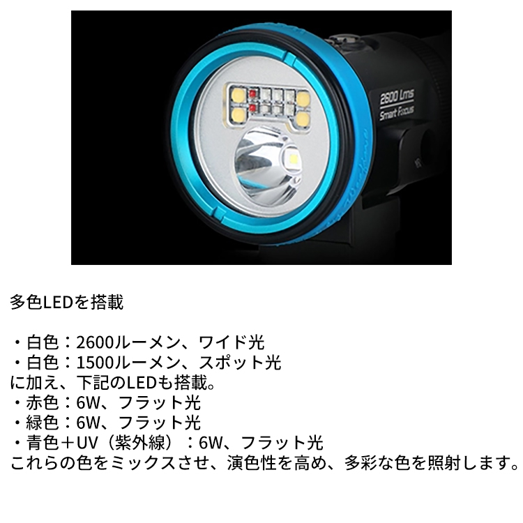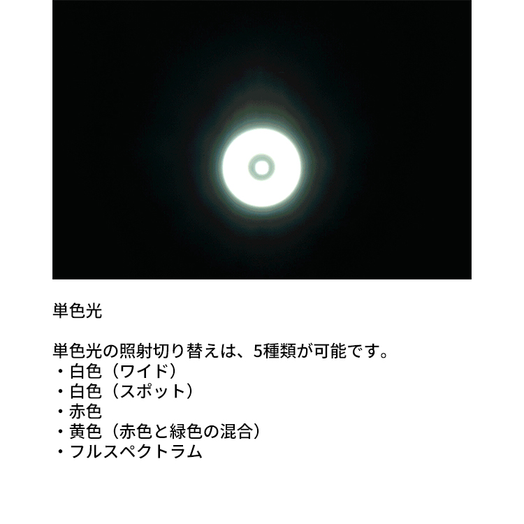 ◆最大2600 ルーメン、照射角110°の白色ワイド光と、最大1500ルーメン、照射角9°の白色スポット光の切り替えが可能。◆白色、赤色、緑色、青色+UV の多色LED を搭載。