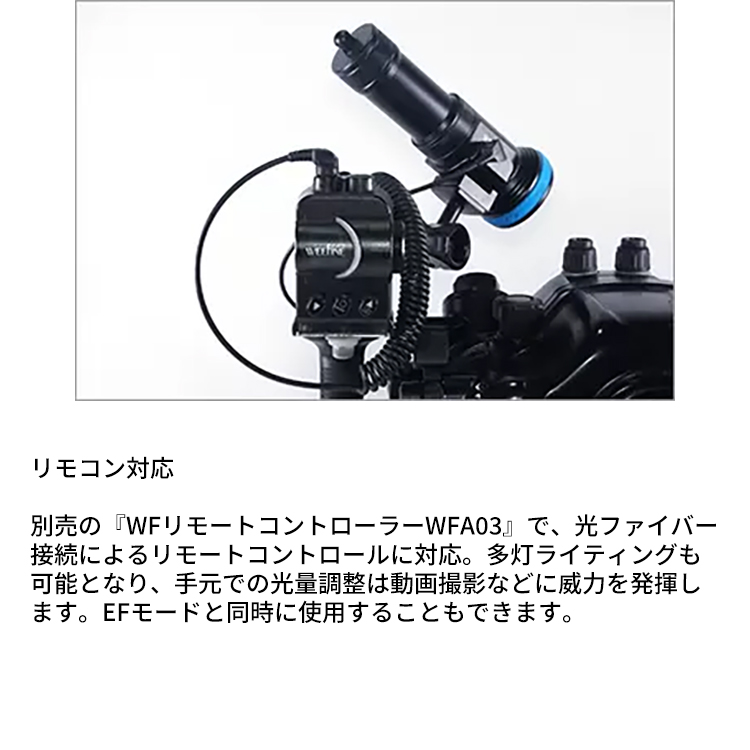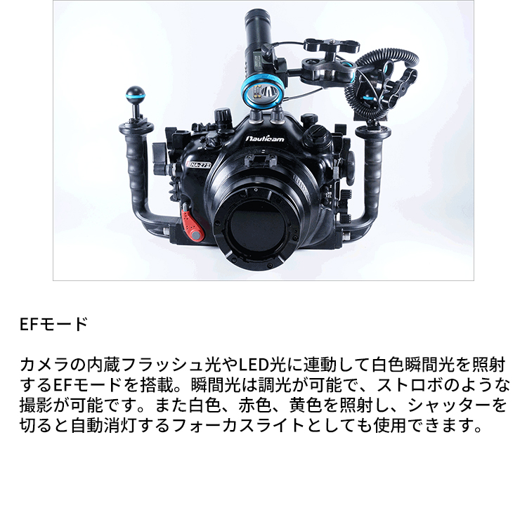◆カメラの内蔵フラッシュ光やLED 光に連動して白色瞬間光を照射するEF モードと、リモートコントロールにも対応。