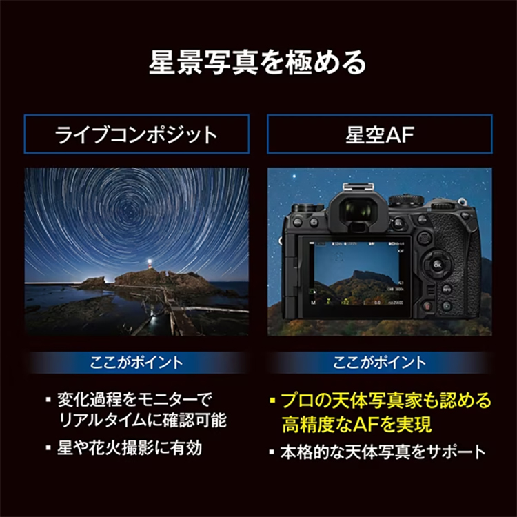 画像処理エンジンTruePic X (トゥルーピック エックス)と有効画素数約2037万画素 裏面照射積層型 Live MOS センサーが、高解像レンズ M.ZUIKO DIGITALの性能を余すことなく引き出し、センサーサイズから想像する画質レベルを超える高画質を提供します。