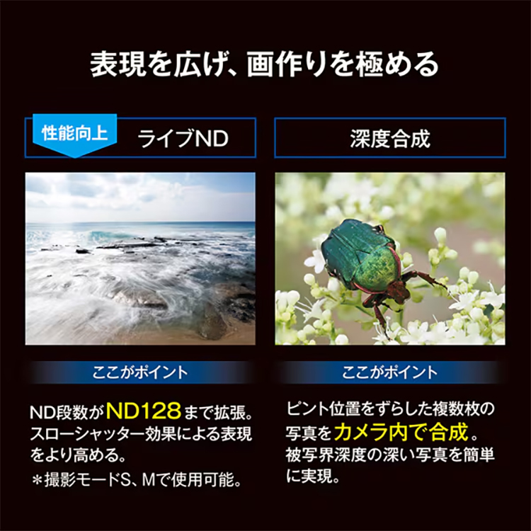 裏面照射積層型Live MOSセンサー、画像処理エンジンTruePic X、高性能レンズによる高解像を実現しました。